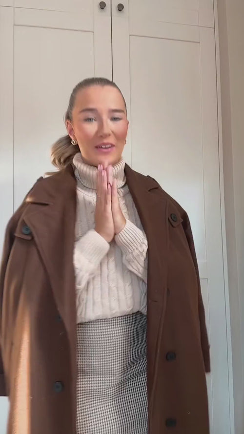 O Casaco Alicia apresenta um fecho clássico de abotoamento duplo e uma gola em V sofisticada, conferindo-lhe um aspeto refinado e elegante. Apesar do seu corte estruturado, o casaco oferece um ajuste solto e confortável, perfeito para sobrepor sobre malhas grossas e camisolas. Fabricado em poliéster premium de alta qualidade com textura semelhante à lã, proporciona isolamento essencial mantendo-se leve.